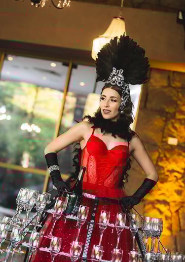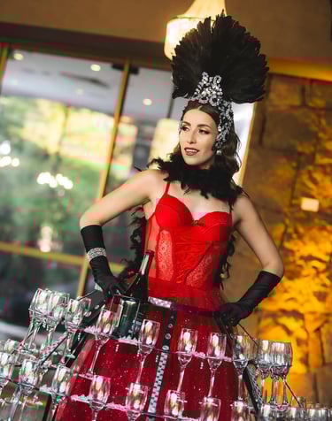 Nuestra anfitriona con su sonrisa contagiosa y su atuendo deslumbrante, se convierte en el centro de todas las miradas, ofreciendo una bienvenida inolvidable y un brindis que tus invitados recordarán para siempre.